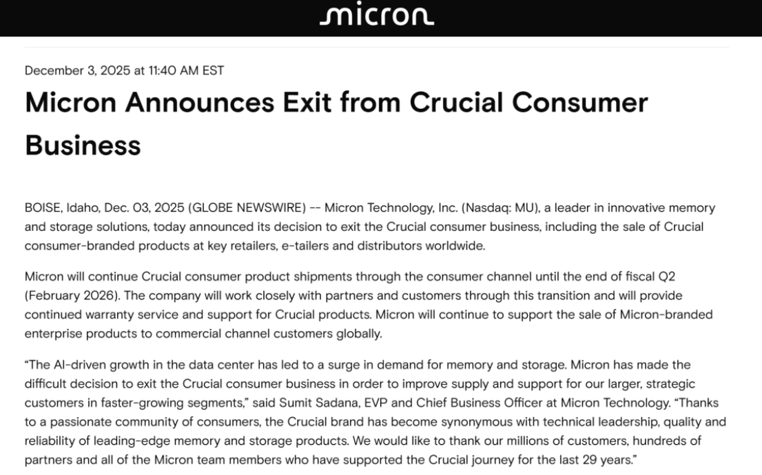 12月,美光宣布,决定退出Crucial(英睿达)消费级业务,包括在全球主要零售商、电商平台和分销商处销售英睿达消费品牌产品。美光方面表示,将通过消费渠道继续供应英睿达消费级产品,直至明年2月。