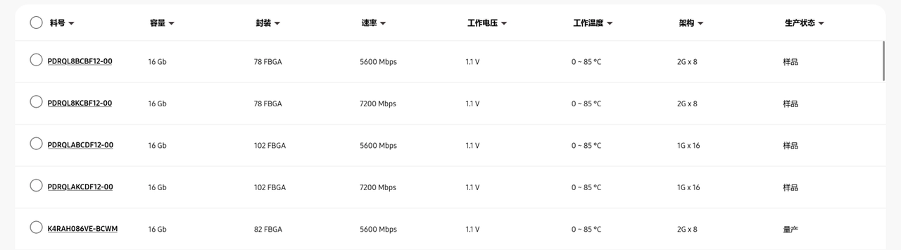 据报道,三星半导体官网的 DRAM / DDR 页面现已列出多款处于“样品”生产状态的 DDR5 内存颗粒新品。