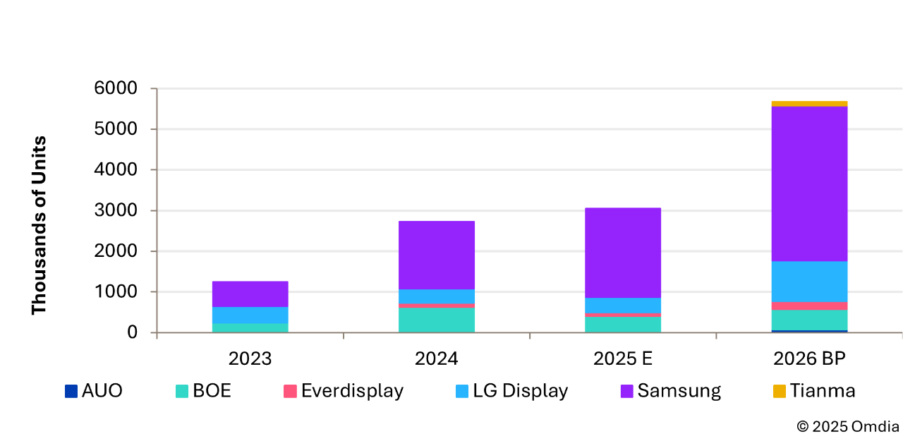 展望2026年,新增需求预计主要来自欧洲OEM,三星显示预计将保持其领导地位,而 LG 显示则有望随着更多项目进入量产阶段而提升市场份额。