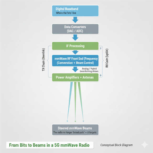 为了应对这些信号损耗和环境敏感性问题,毫米波系统采用了一种不同的传输技术。毫米波无线电不会均匀发射能量,而是将能量集中到窄波束中,以克服更大的路径损耗。信号最初以数字数据的形式在基带处理器中生成,随后被转换为电波形,再上变频至极高的无线电频率。在该频段下,小型天线阵列协同工作,以精确控制的时间偏移发射同一信号,从而使能量在选定方向上产生相长干涉。这一技术即为波束成形。