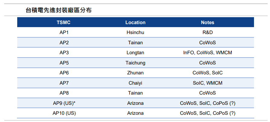 台积电的先进封装厂区广泛分布,包括龙潭(AP3)、台中(AP5)、竹南(AP6)、嘉义(AP7)、台南(AP8)等。其中,AP8 的扩产加速主要用于满足CoWoS-L 的需求,而嘉义的AP7 则专注于SoIC 和WMCM。在美国亚利桑那州(Arizona)的AP9 和AP10 厂区,未来规划亦将包含CoWoS、SoIC 及CoPoS 技术。