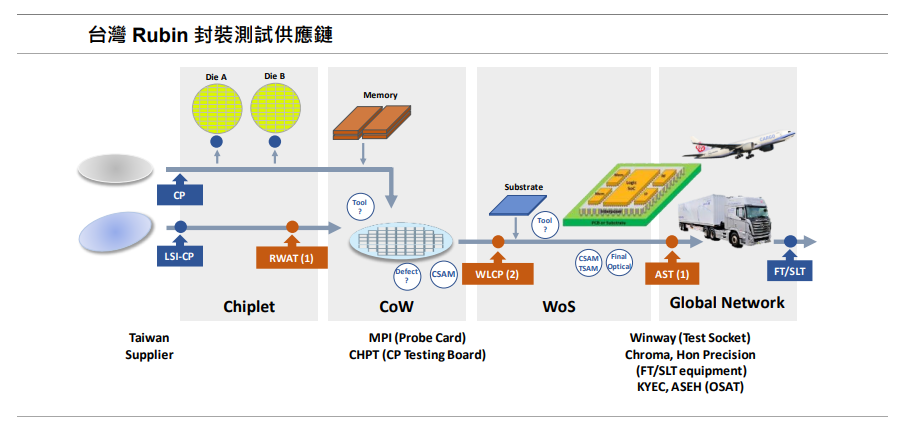 在致茂方面,受惠于SLT 设备升级(Rubin 机台ASP 预计提升33%),以及Metrology(探针针痕机)设备逐步导入国内晶圆代工厂和OSAT 的先进封装新建产线。最后在颖崴部分,受惠于大尺寸封装测试座需求,其测试座在NVIDIA AI GPU 的领导地位稳固。