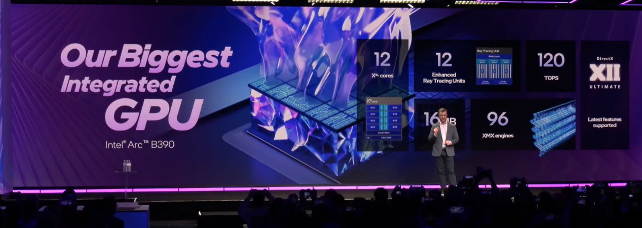 图形处理能力的提升是此次发布会的另一大技术重点。英特尔推出了基于Xe3架构的全新集成显卡——Intel Arc B390。相比前代产品,新款核显不仅增加了50%的图形核心和两倍的缓存,还内置了96个XMX AI加速器。在性能测试中,Arc B390的游戏性能较Lunar Lake提升了70%,AI推理性能提升了50%。在同等功耗与内存配置下,其帧率表现比竞争对手高出70%。值得注意的是,英特尔首次在集显端引入了基于AI的多帧生成技术,能够实现“渲染1帧,AI生成3帧”的效果。EA技术副总裁Jeff Skelton在现场展示了《战地6》的实机运行情况,验证了该技术在3A大作中实现高帧率流畅体验的能力。