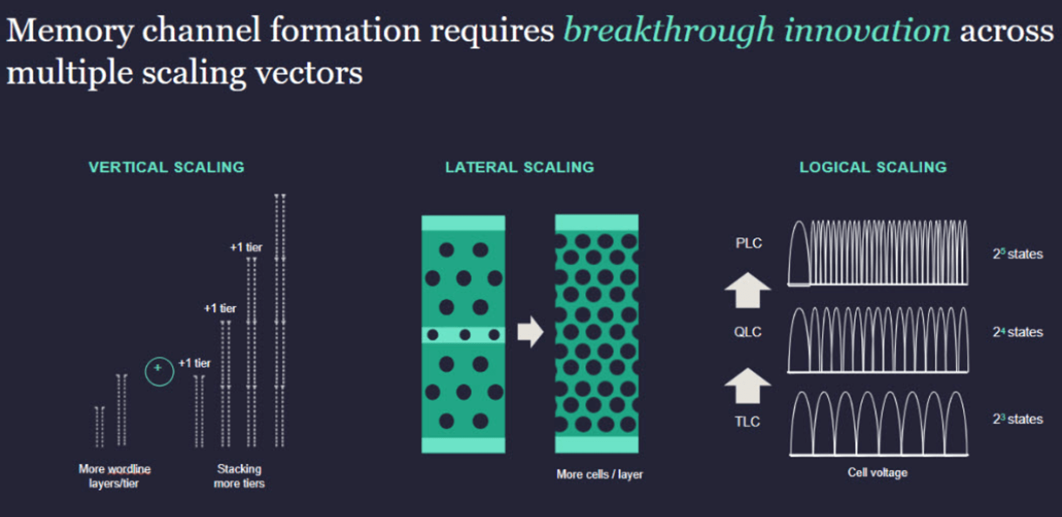 图 1:NAND 闪存通过减小单元间距和尺寸、堆叠字线以及增加每个单元的位数来实现规模化。来源:Lam Research