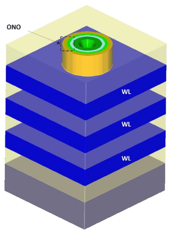 图 2:三维 NAND 门环绕式架构示意图,图中显示了一串垂直排列的电荷陷阱单元,采用氧化物-氮化物-氧化物 (ONO) 栅极介质,以及数量有限的字线。来源:imec