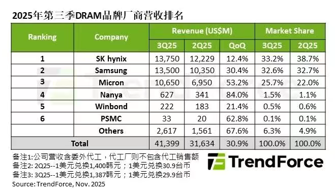 在市场情况方面,TrendForce数据显示,2025年第三季度DRAM产业营收较前一季成长30.9%,达414亿美元。其中,南亚科排名第四,受惠于出货量、售价显著季增,营收季成长高达84%,达6.3亿美元。
