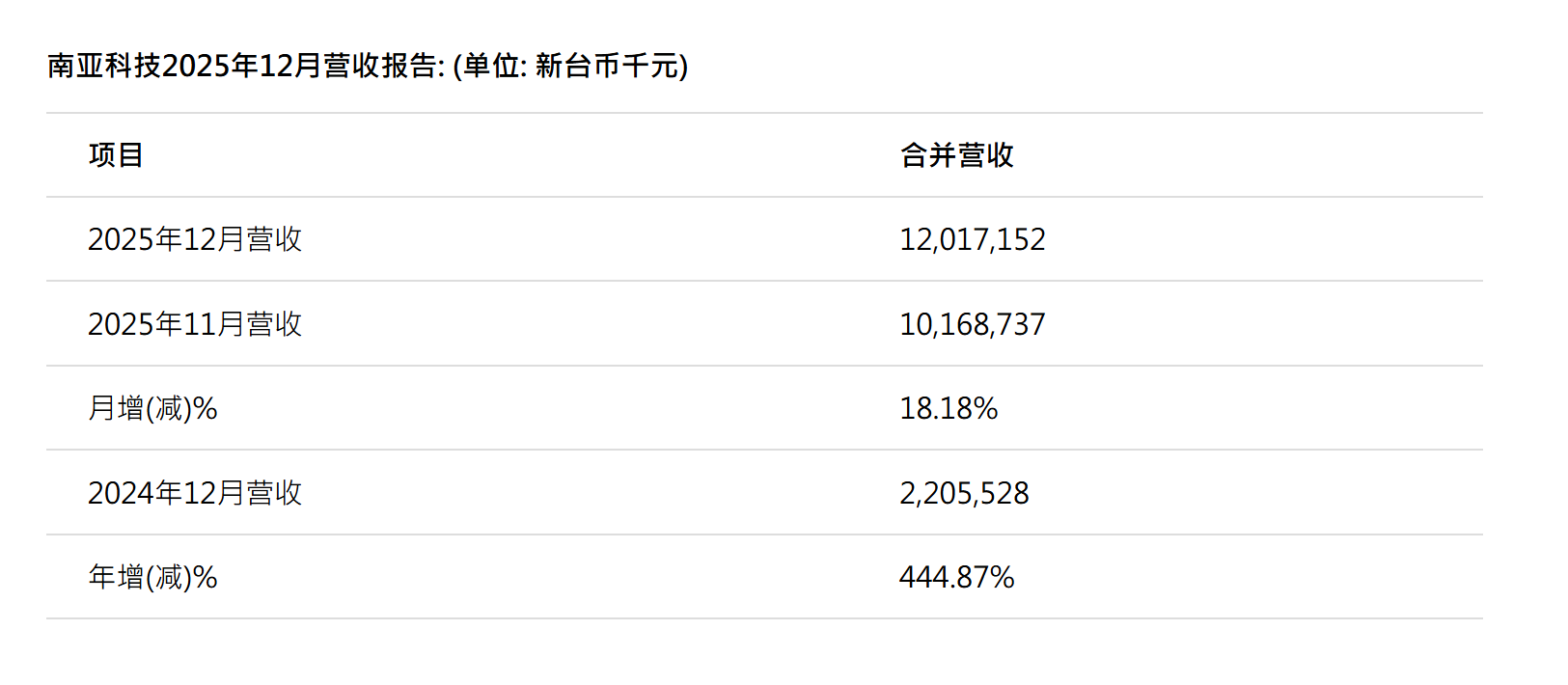 1月6日,南亚科发布2025年12月营收情况,2025年12月自结合并营收为新台币120.17亿元,较上月增加 18.18%,较去年同期增加444.87%。累计合并营收为新台币665.87亿元,较去年同期增加95.09%。
