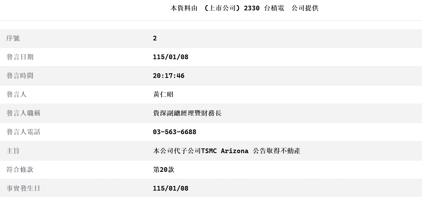 1月8日,台积电发布公告称,董事会通过于美国亚利桑那州凤凰城购地案,将向亚利桑那州政府取得约365万平方米土地,交易总金额达1.97亿美元(约新台币63亿元)。
