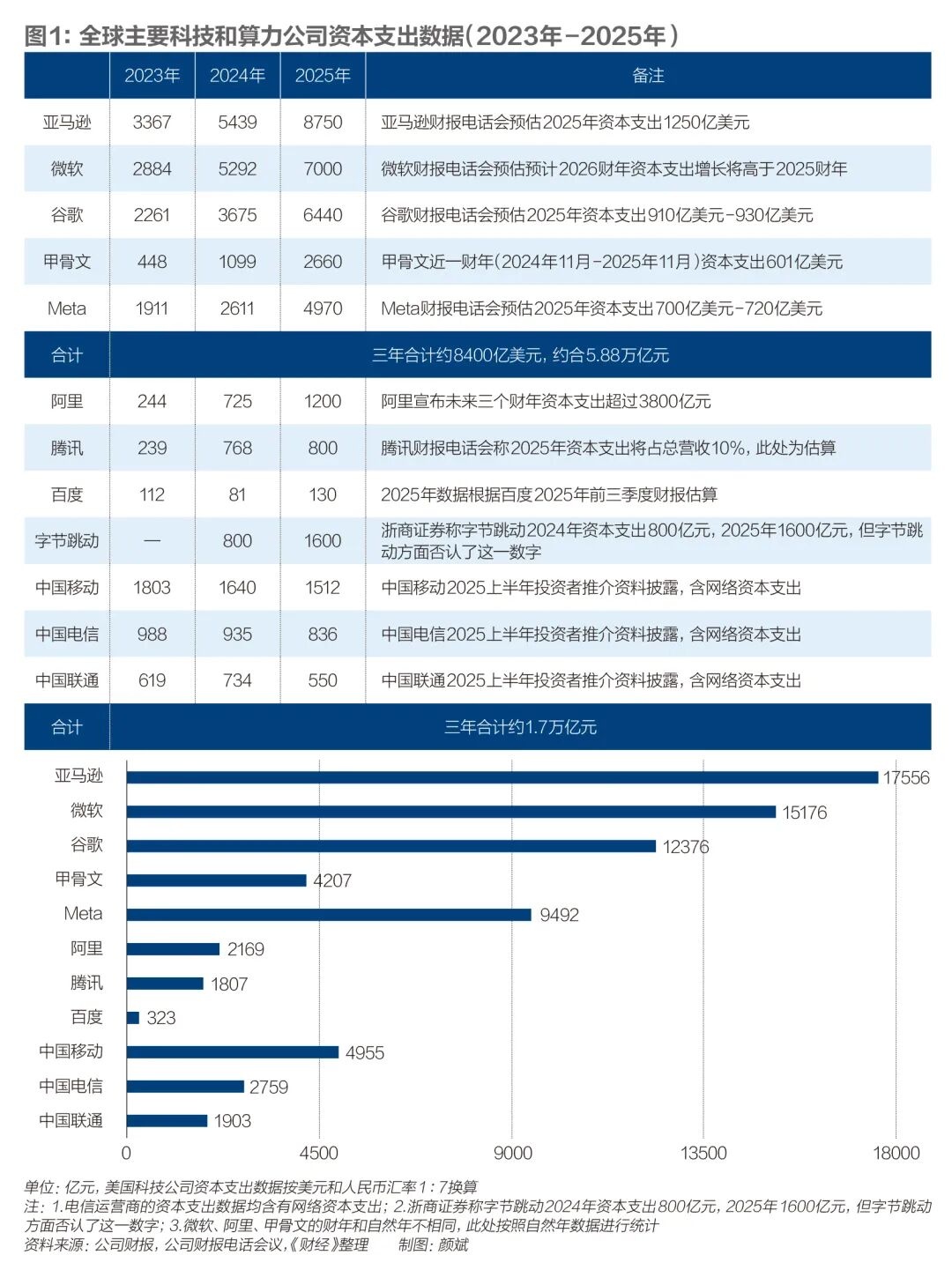 《财经》统计发现,微软、亚马逊、谷歌、甲骨文、Meta 2023年-2025年资本支出总额约8400亿美元(约合5.9万亿元),同期中国科技公司和电信运营商(包括阿里、字节跳动、腾讯、百度、中国移动、中国电信、中国联通)资本支出总额约1.7万亿元。