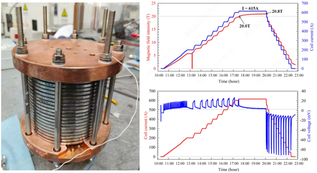 近日,能量奇点自主研制的纯导冷结构高温超导磁体成功励磁至20.8特斯拉,经150分钟稳定运行后安全退磁。该磁体由20个单饼组成,外直径120mm,单饼绕制直径30mm,为无绝缘结构,采用纯导冷方式运行。该磁体运行的初始温度为10K,在整个励磁过程中温升始终控制在5K以内。该磁体及相关技术将应用于能量奇点自主研制的商用级材料性能测量平台,包括综合物性测量系统、临界电流高场角度依赖性测量系统等。