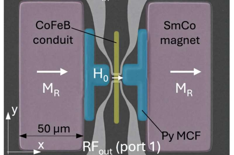 新研发的器件通过三重创新实现了突破性进展。在结构设计上,其尺寸仅为 100×150 平方微米,较现有基于声波的射频信号处理设备缩小一个数量级 —— 后者即便最紧凑的型号也需毫米级空间,且无法在高频段保持稳定性能。更关键的突破在于磁控方案:研究团队采用 SmCo 微磁体与磁通集中器的创新组合,彻底摒弃了外部磁体的需求。SmCo 作为稀土永磁材料,不仅具备 16-30 MJ/m³ 的高能量密度,更能在 200°C 高温下保持磁性能稳定,部分高端型号甚至可耐受 350°C 极端环境,且无需表面涂层即可抵御腐蚀。这种材料特性使其能在芯片内部持续产生稳定磁场,且全程不消耗能量,完美契合低功耗设计需求。