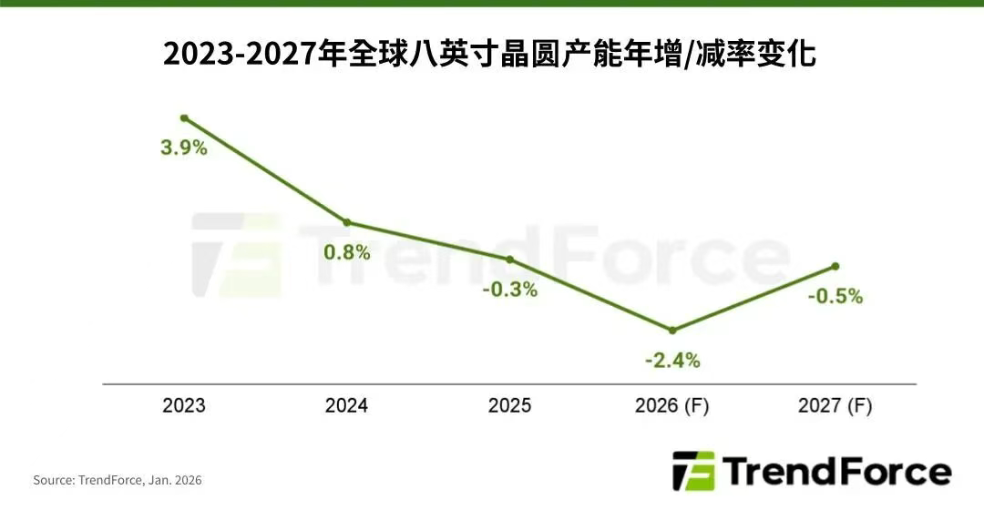 据TrendForce预计,2025年全球八英寸产能将因此年减约0.3%,正式进入负成长局面。2026年尽管中芯国际、世界先进等计划小幅扩产,仍不及两大厂减产幅度,预估产能年减程度将扩大至2.4%。