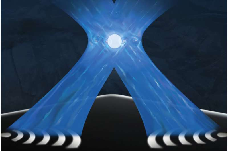 为了实现这种更复杂的相互作用,研究人员设计了一种带有两个纳米级天线的芯片,这些天线从芯片发射光束以操控其上方的离子。这些天线通过波导连接,波导将光路由到天线。波导旨在稳定光路,从而提高光束产生的涡旋图案的稳定性。