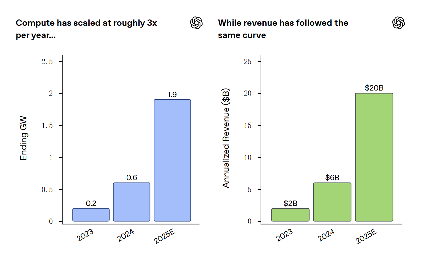 具体而言,过去三年OpenAI算力的增长路线为2023年0.2GW,2024 年提升至 0.6GW,2025 年约为 1.9GW;与此同时,收入也保持着同样的增长曲线,2023 年为20亿美元,2024年为60亿美元,预计在2025年超过200亿美元。
