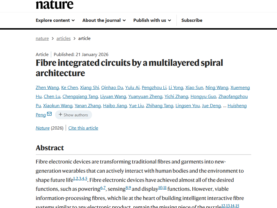 据复旦大学公众号介绍,今天凌晨,国际顶级学术期刊《自然》主刊发表了复旦大学彭慧胜/陈培宁团队的最新研究成果《基于多层旋叠架构的纤维集成电路》,团队成功在柔软的高分子纤维内制造出大规模集成电路,创造出世界首款“纤维芯片”。有望为脑机接口、电子织物、虚拟现实等新兴产业提供强有力的技术支撑。