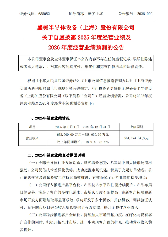 对于本次业绩变化的原因,盛美上海表示,报告期内,全球半导体市场需求强劲,公司凭借技术差异化优势,持续推进销售交付与调试验收,产品平台化进展顺利,客户全球化拓展成效显著,新客户开发取得突破,市场认可度不断提升,推动营业收入稳步增长。综合近年来的业务发展趋势,以及目前的订单等多方面情况,公司预计2026年全年的营业收入将在人民币82.00亿元至88.00亿元之间。
