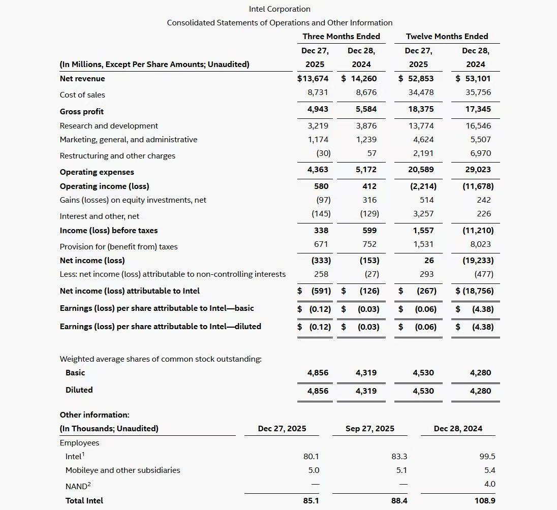 刚刚,英特尔发布了2025年第四季度财报,公司营收136.7亿美元,同比减少4.1%,市场预估134.3亿美元;第四季度调整后每股收益0.15美元,上年同期0.13美元,预估0.09美元。2025年全年营收为528.53亿美元,同比降0.5%。