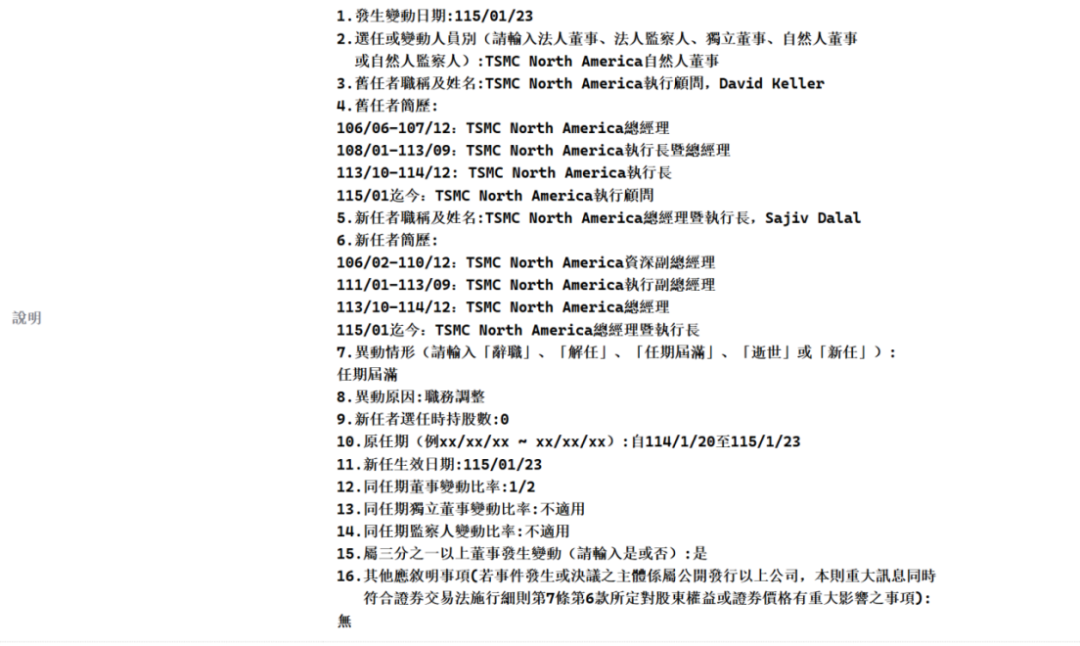 根据公告,原任TSMC North America自然人董事、并担任执行顾问的David Keller,因任期届满卸任董事职务。Keller长期深耕台积电美国营运,曾于2017年至2018年间出任TSMC North America总经理,2019年至2024年9月担任执行长暨总经理,2024年10月至2025年底担任执行长,并自2026年1月起转任执行顾问,持续提供策略与营运建议。