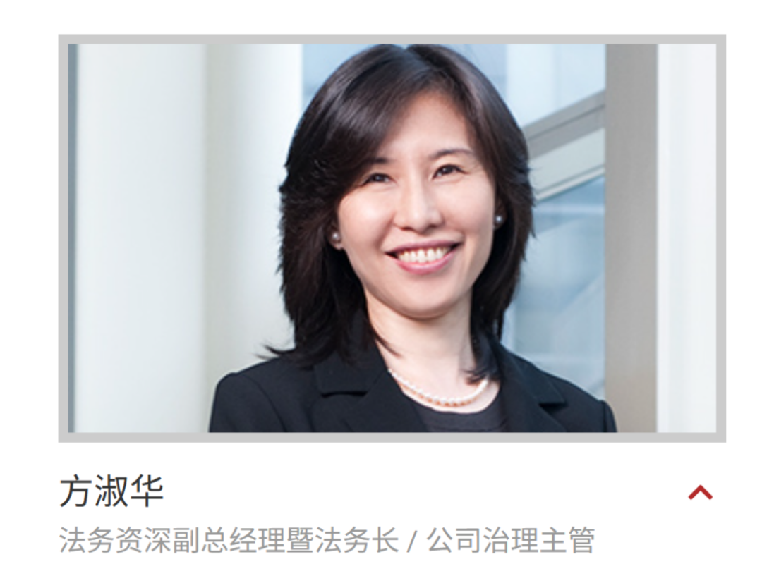 台积电官网显示,方淑华女士1995年加入公司并担任公司法务处处长,负责处理许多备受瞩目的公司交易案、以及开创先例的智慧财产与营业秘密诉讼案。2014年2月起,方女士担任台积公司副法务长,同年8月擢升法务副总经理暨法务长迄今。方女士亦经董事会任命为台积公司公司治理主管及董事会秘书,负责处理董事会、审计委员会、薪酬委员会及股东会等相关业务。