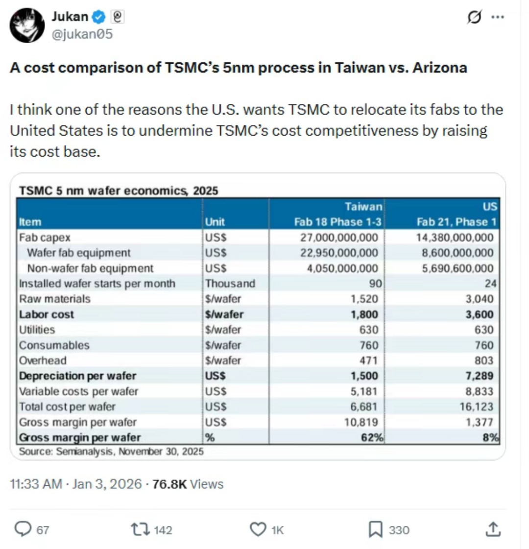 除此之外,台积电美国工厂利润还很低。据分析师Jukan在社交平台上分享的SemiAnalysis汇总数据显示,台积电在美国生产芯片将使其利润率遭受重大损失。台积电在中国台湾地区生产5纳米制程芯片与美国生产相同产品的每片晶圆毛利率分别为62%与8%,两者相差54个百分点。其中,折旧和劳动力成本是造成差异的主要原因。
