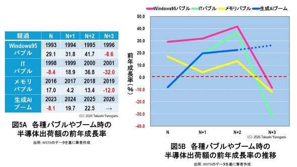 图5A通过对比表形式,呈现了Windows 95泡沫、IT泡沫、内存泡沫及当前AI热潮(暂统称“热潮”)从第N年到第N+3年的同比增速变化;图5B则进一步量化了这一波动:Windows 95泡沫期间增速达41.7%,随后骤降至-8.6%;IT泡沫增速36.8%,后续跌至-32.0%;内存泡沫增速13.4%,继而滑落至-12.0%。这种“繁荣后迅速萧条”的剧烈波动,正是过往泡沫的典型特征。
