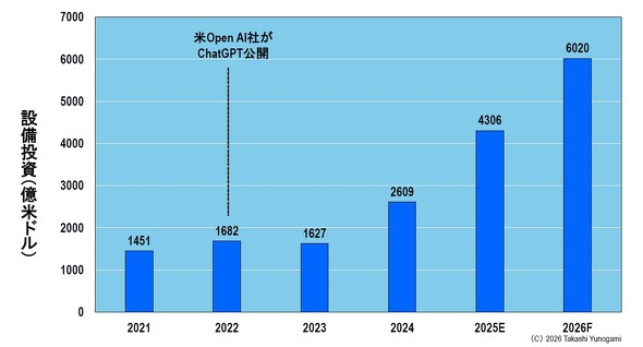 云服务商的资本支出(Capex)已经达到了无法再用“显著增长”来形容的程度。排名前八的云服务商的投资额将从2021年的1451亿美元增长到2026年的6020亿美元,增长超过四倍。这种增长速度简直令人难以置信。