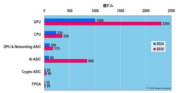 图 7:数据中心逻辑预测(2024 → 2030 年)。来源:作者根据 Yole Group 的预测数据制作