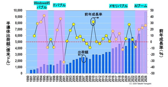 图 4:全球半导体出货量及较上年增长率。来源:作者根据 WSTS 数据制作