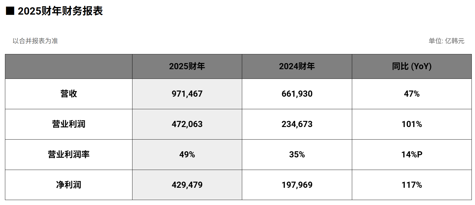 2025财年SK海力士营业收入为97.1467万亿韩元,营业利润为47.2063万亿韩元(营业利润率为49%),净利润为42.9479万亿韩元(净利润率为44%)。此次业绩远超2024年创下的历史最高记录。营收同比增长逾30万亿韩元,营业利润也实现翻倍增长,刷新了历史最高年度业绩。