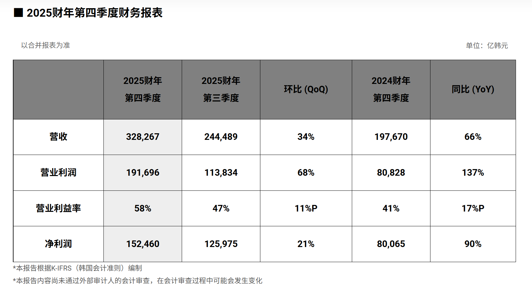 单季度来看,第四季度SK海力士同样创下了季度历史最佳业绩:营收为32.8267万亿韩元,环比增长34%,营业利润为19.1696万亿韩元,环比增长68%,营业利润率达58%,三项指标均刷新历史记录。