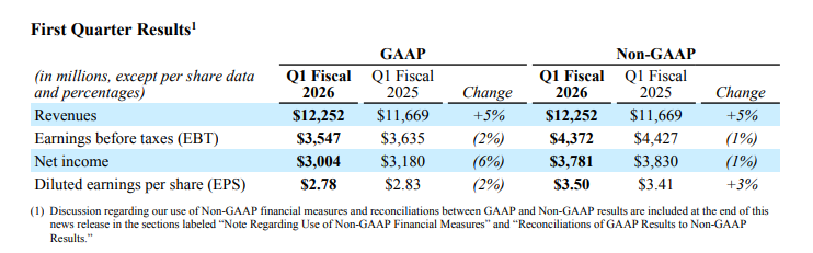 高通公布了2026财年第一季度财务业绩。报告显示,公司该季度营收达122.5亿美元,同比增长5%;调整后净利润37.81亿美元,同比下降1%;调整后每股收益3.50美元,较上年同期的3.41美元略有提升,整体业绩超出市场预期。
