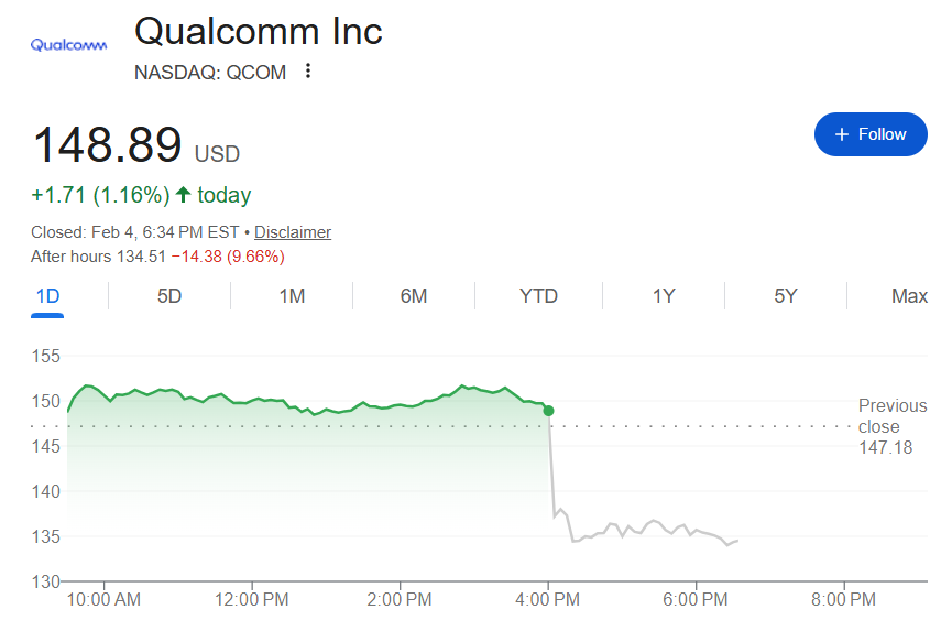 展望未来,高通预计第二财季营收在102亿至110亿美元之间;调整后每股收益在2.45美元至2.65美元之间。而接受LSEG调查的分析师预计,高通第二财季营收为111.1亿美元,每股收益为2.89美元。