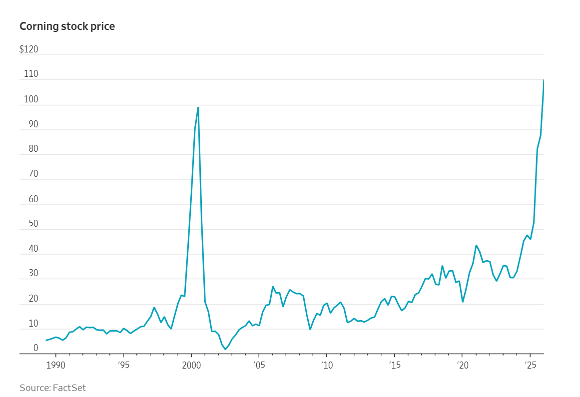 如今,在全球竞相为人工智能驱动的未来构建足够算力的竞赛中,康宁公司(Corning)的线缆已成为首选连接器。对于这种相对不起眼却极具高科技含量的组件来说,这一灰姑娘般的故事不仅是这家拥有175年历史的公司的福音,也给人们上了一课:长期愿意为新想法承担亏损最终会带来回报。