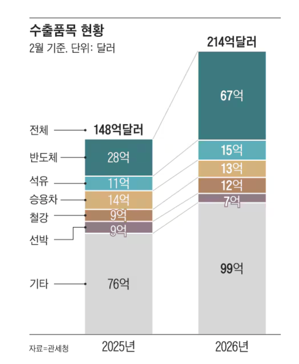 半导体出口额较去年同期增长137.6%,达到67.29亿美元。计算机外围设备(增长90.2%)、家用电器(增长36.4%)和石油产品(增长40.1%)也推动了2月初出口额的增长。然而,船舶(下降29%)和乘用车(下降2.6%)的出口额有所下降。按目的地划分,对美国的出口增长了38.5%,对中国(增长54.1%)和越南(增长38.1%)的出口也均有所增长。同期进口额为207亿美元,增长21.1%。出口额超过进口额,贸易顺差达6亿美元。
