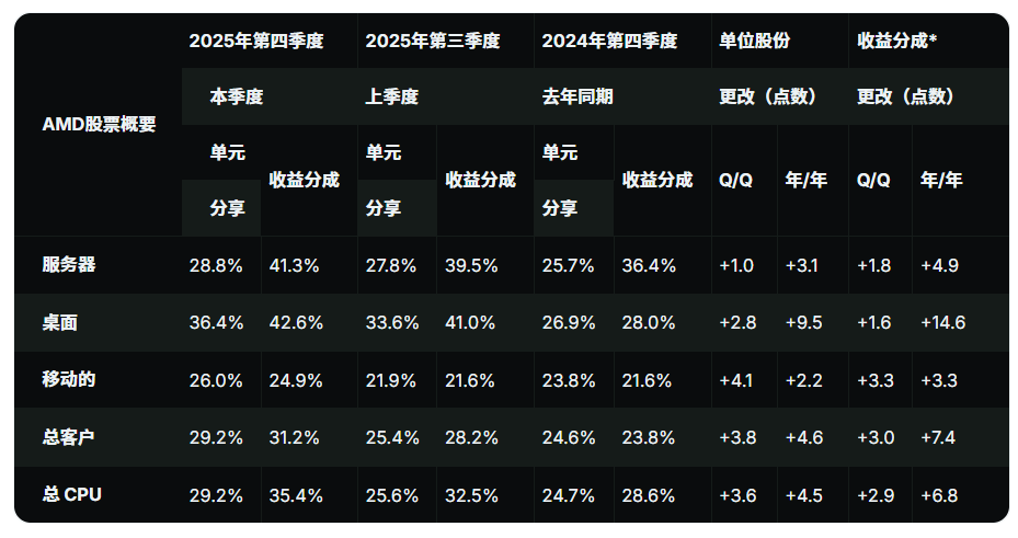 总体而言,AMD 客户端 “Ryzen” CPU 的市场份额为 29.2%(出货量)和 31.2%(营收),分别较上年增长 3.0 个百分点和 7.4 个百分点。AMD 整体 CPU 市场份额为 29.2%(出货量)和 35.4%(营收),分别较上年增长 2.9 个百分点和 6.8 个百分点。这一系列数据背后,是 AMD 多年来在架构研发、制程工艺、生态建设等方面持续投入的成果,也反映出市场对其产品价值的广泛认可。2025 年 AMD 数据中心业务收入达 166 亿美元,同比增长 32%,成为公司核心增长引擎,与客户端业务形成双轮驱动的发展格局。