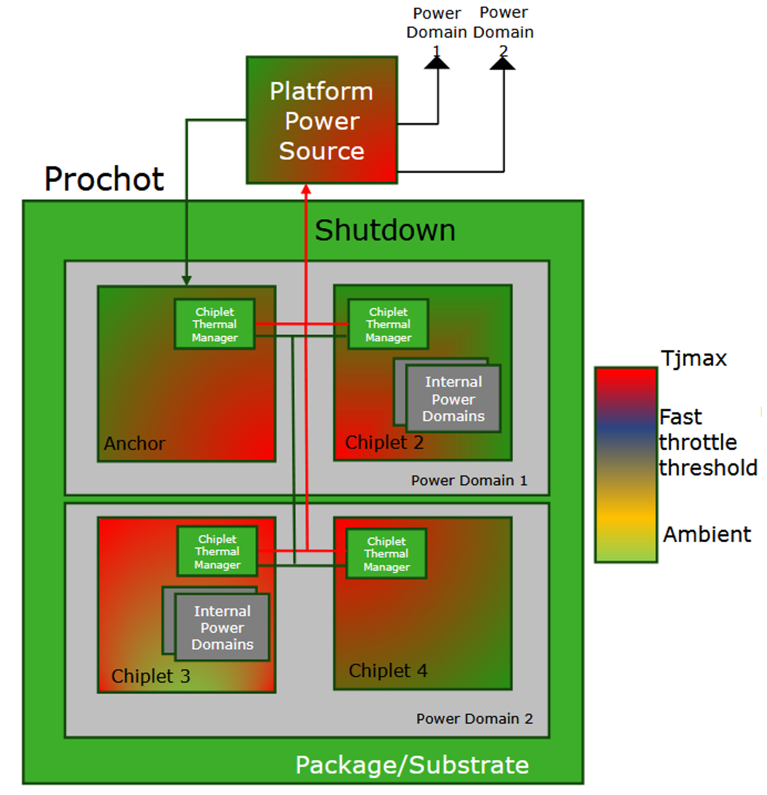 “一旦出现问题,需要快速响应。如果通过常规方式,边带或主通道传输指令,速度会太慢。”Mota 说,“开漏引脚提供了一种标准化的快速响应机制。一旦某个小芯片过热,可同时通知所有部件:‘即将进入下一状态’,所有芯片立即执行,无需经过关断协议流程。”