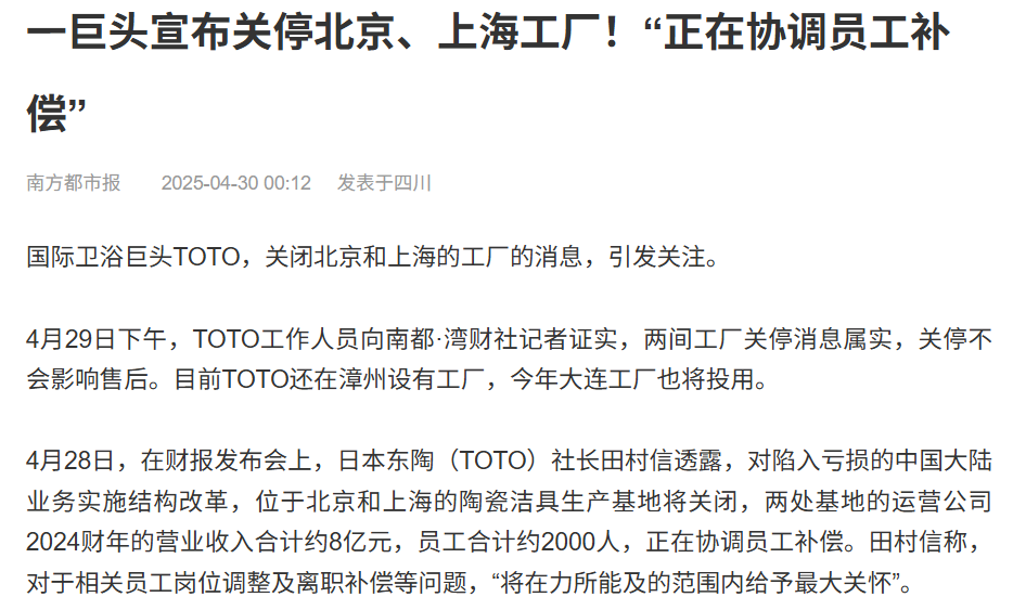 如果你只看传统卫浴产品,东陶这几年在国内被打得丢盔弃甲,从年赚几亿,到亏损数千万,还关掉了运营多年的北京、上海工厂,国产品牌正在疯狂吞噬它的份额。