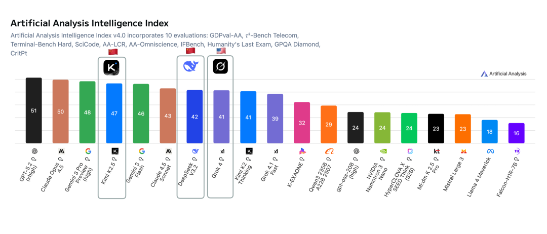 在权威评测机构Artificial Analysis的榜单上,xAI旗舰模型Grok4性能比不上中国公司开源的DeepSeek V3.2和Kimi K2.5……但估值却是他们加起来的好几倍!