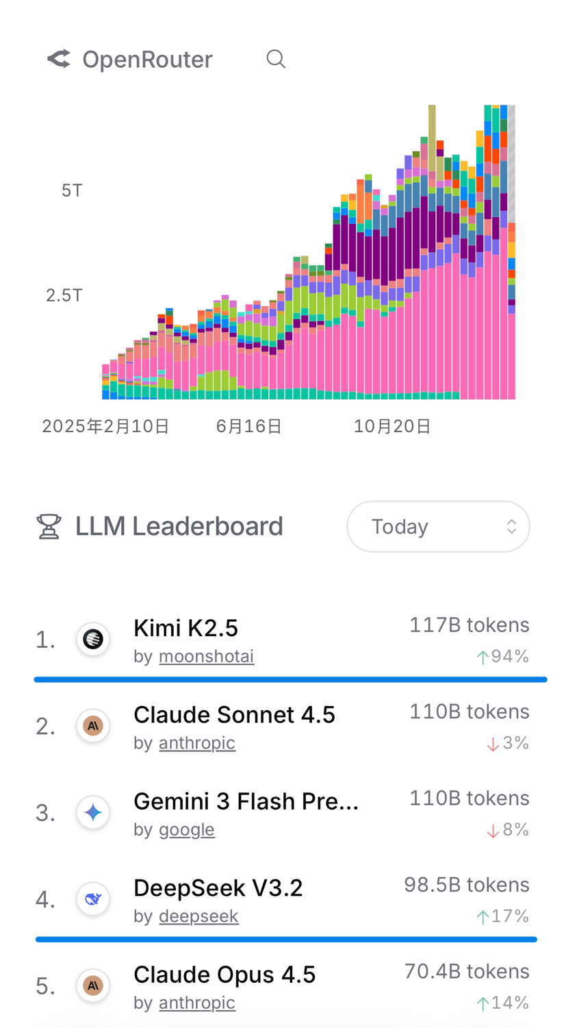 在全球最大的大模型API聚合平台上,来自中国的开源模型,超过很多顶尖的美国闭源模型,成为最受全球开发者欢迎、调用量前五的模型。