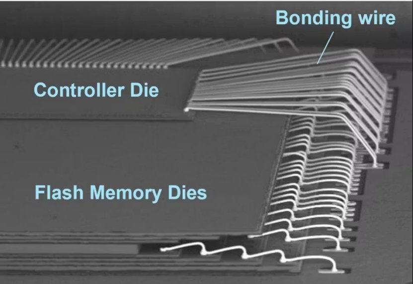 对于裸NAND闪存,存储器供应商可以将1到16个裸NAND芯片封装在一个封装内。系统中的主机处理器或外部闪存控制器必须处理诸如纠错编码(ECC)、损耗均衡、坏块管理、逻辑到物理映射以及垃圾回收等任务。