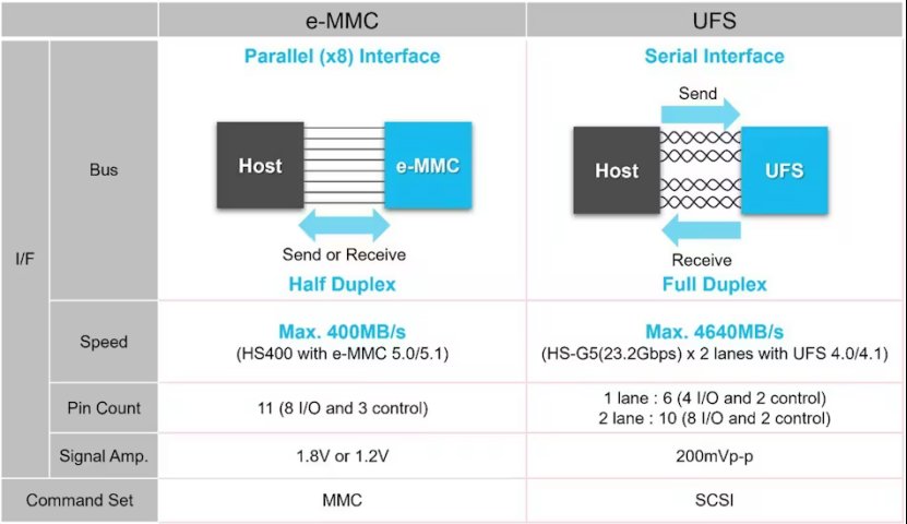为了解决这个问题,JEDEC 于 2011 年推出了 UFS,作为 eMMC 的预期继任者。UFS 没有采用并行总线,而是使用高速串行接口。其结果是实现了点对点连接,支持全双工通信(即同时进行读写操作),同时还具有更低的延迟和更高效的命令处理能力。