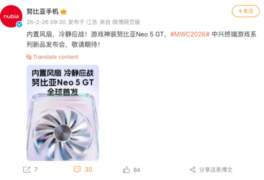 此外,内置风扇的努比亚Neo 5 GT 也将全球首发,继续强化其“游戏神装”的标签。作为前代产品,努比亚Neo 3 GT于2025年3月同展发布,搭载紫光展锐T9100处理器、12GB内存及6000mAh电池。