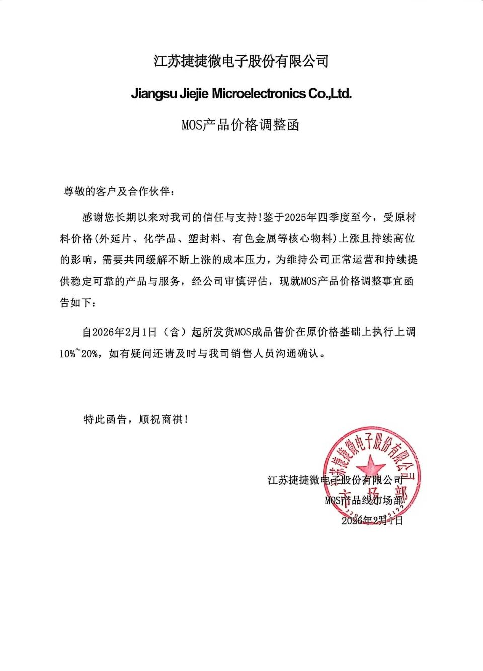 同日捷捷微电宣布,对其MOS系列产品提价10%-20%,自2026年2月1日起,新发MOS成品均按新价格执行。