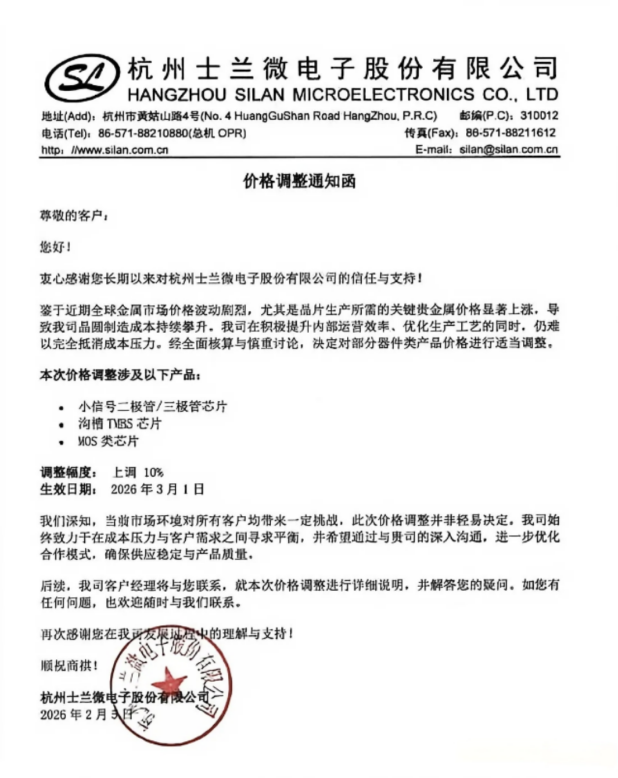 2月5日,杭州士兰微电子股份有限公司向客户发布《价格调整通知函》,宣布将对部分器件类产品价格进行上调,调整幅度为10%,自2026年3月1日起正式生效。根据涨价函显示,此次涨价的产品主要涉及三类核心产品:包括小信号二极管/三极管芯片、沟槽TMBS芯片和MOS类芯片。