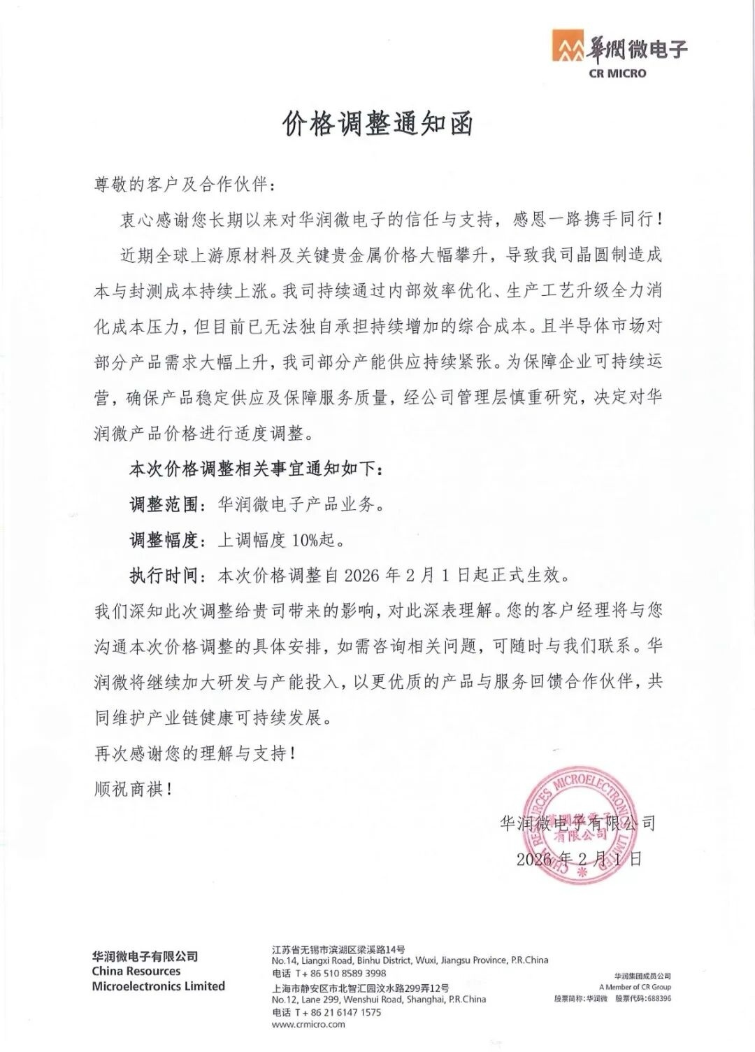 除了上述几家公司,华润微电子也正式发布重磅价格调整公告,明确自2026年2月1日起,对公司全系列微电子产品启动价格上调,上调幅度最低10%。华润微主要产品包括以 MOSFET、IGBT、第三代宽禁带半导体为代表的功率半导体产品,以光电传感器、烟报传感器、MEMS传感器为主的传感器产品,和以MCU为代表的智能控制产品等。