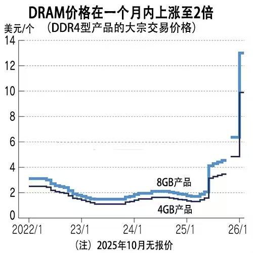 另一家市场研究机构数据显示,2026年1月,作为指标的DDR4型8GB产品的大宗交易价约为每个13.0美元,达到2025年11~12月的2倍。相比1年前更是暴涨至7.4倍。DRAM采购难的问题正进一步加剧。 2026年1月,作为通用产品指标的DDR4型8GB产品的大宗成交价约为每个13.0美元。容量小的4GB产品约为9.89美元左右。均是2025年11~12月的2倍,是1年前(2025年1月)的7.4倍。有电子商社高管坦言:“涨价速度太快,如果还按一个月前的价格水平判断,就会完全跟不上形势。”