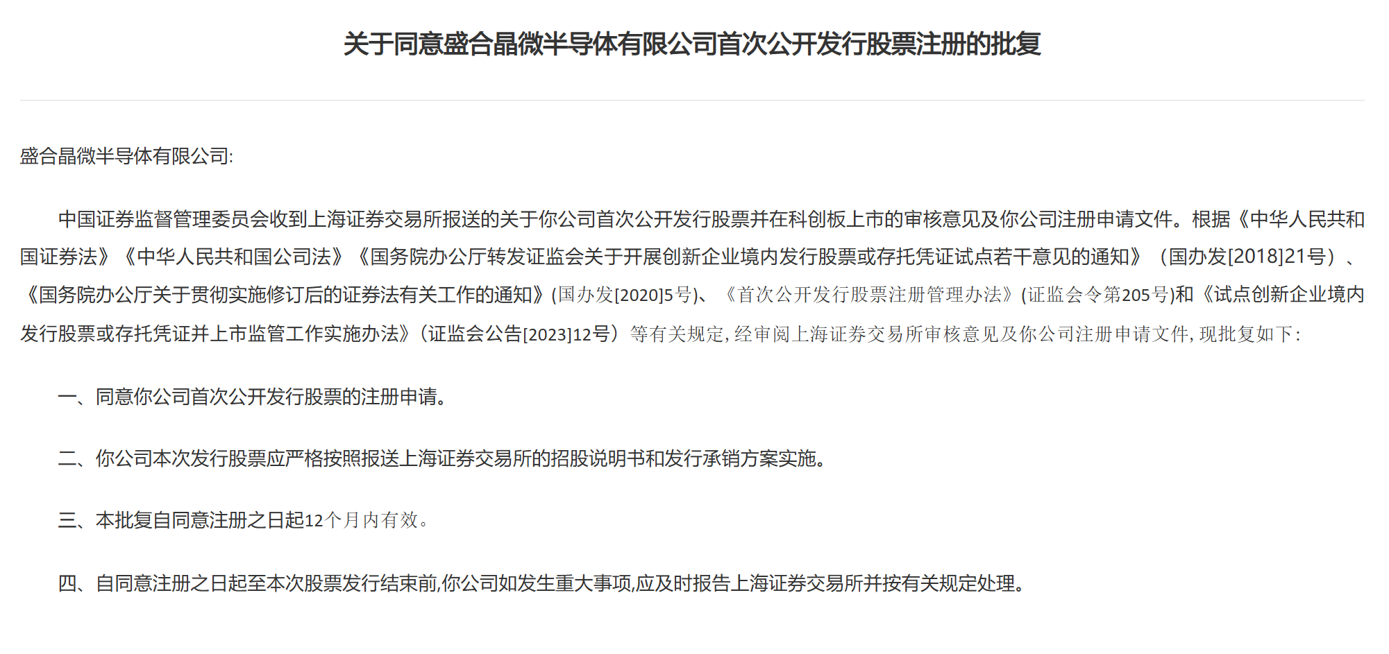 证监会同意盛合晶微半导体有限公司(简称“盛合晶微”)首次公开发行股票并在科创板上市的注册申请。