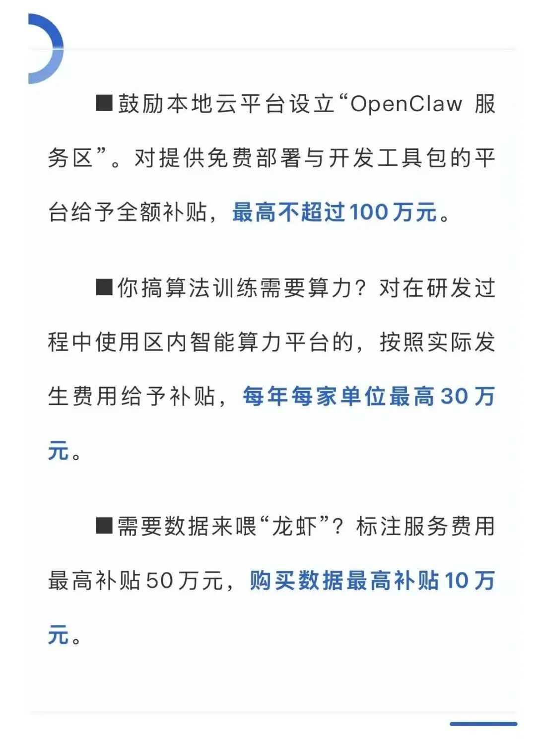 12条“养龙虾”政策,从基础支持到产业落地,从人才引育到安全合规,单项支持最高达500万元。征集意见稿提出,对提供免费部署与开发工具包的本地云平台,给予最高100万元的全额补贴。对使用区内智能算力平台的OPC项目,按实际费用给予补贴,每年每家最高30万元。