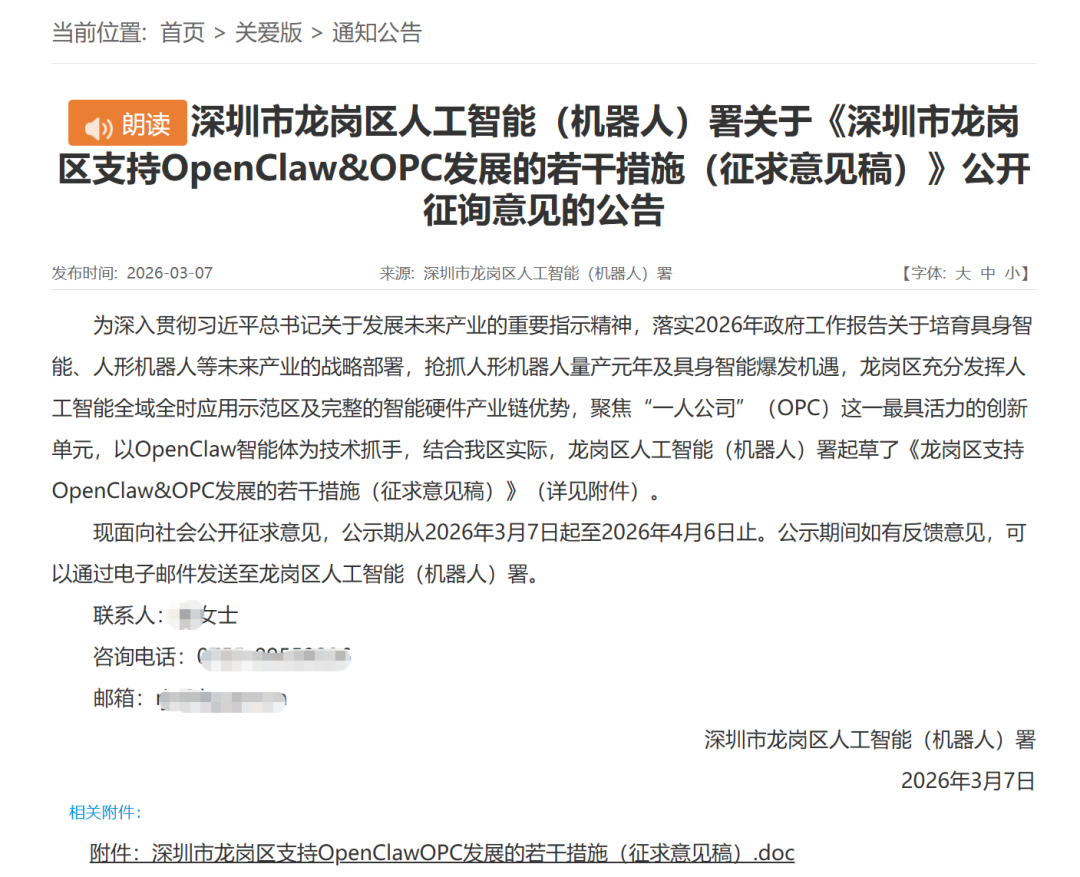 深圳市龙岗区人工智能(机器人)署近日就《深圳市龙岗区支持OpenClaw&OPC发展的若干措施(征求意见稿)》公开征询意见。