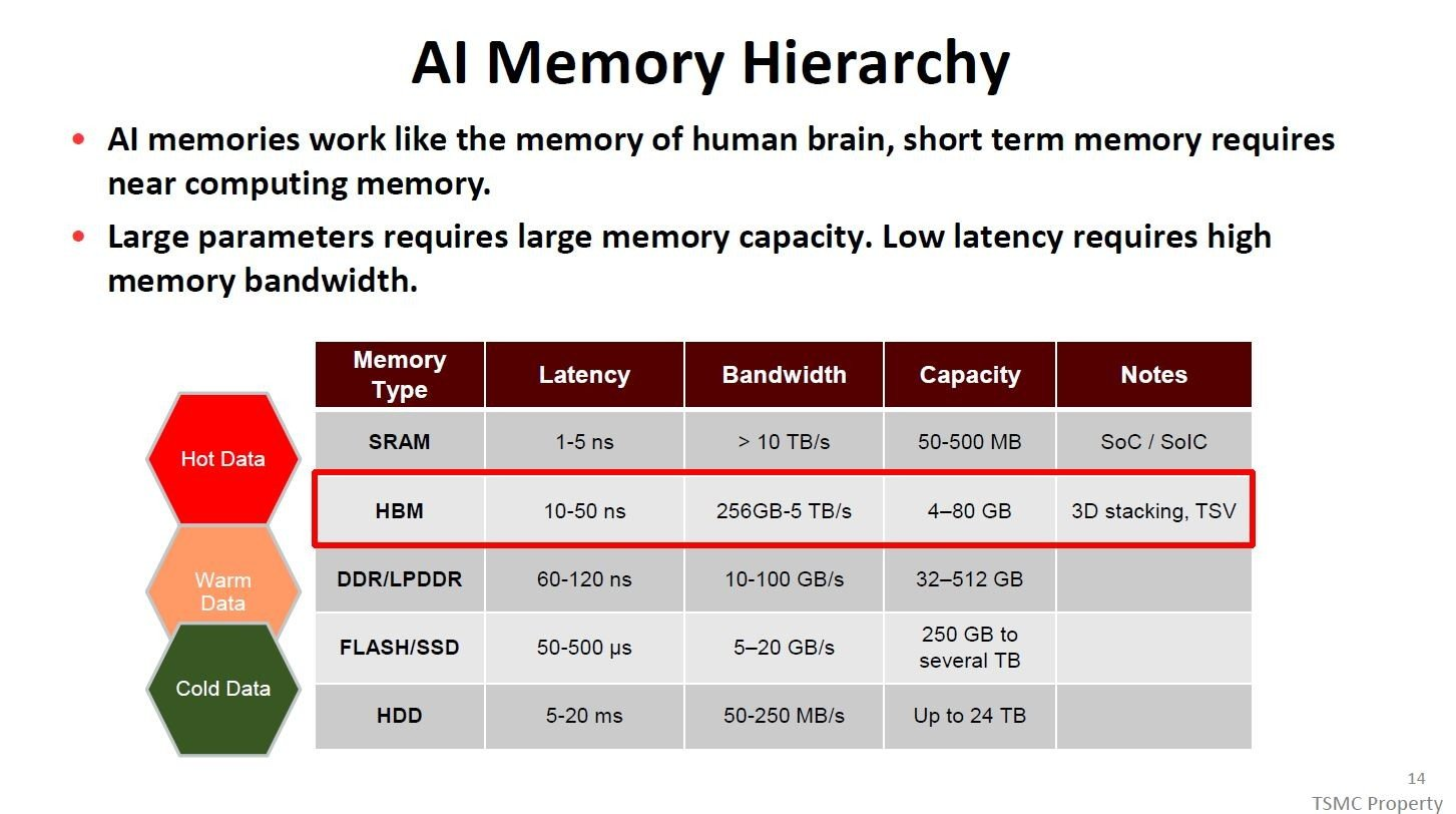 紧随SRAM之后、速度位列第二的则是基于DRAM技术的HBM高带宽内存,凭借出色的带宽与延迟表现,它成为了高端人工智能与高性能计算系统中的主内存,扛起核心计算场景下的数据调度重任。再往下则是DDR/LPDDR DRAM技术,这类内存的速度略逊于HBM,在高端AI与HPC系统中,它作为第二层主内存辅助HBM完成数据存储与调用;而在中端AI与HPC系统中,受成本、性能适配性等因素影响,它会直接升级为第一层主内存,成为核心算力载体。
